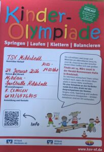 Aushang Kinderolympiade von redakteur-tsv | Jan. 19, 2026 ‹ zurück Vorläufe zur Kinderolympiade in der Mildauhalle am 24. Januar